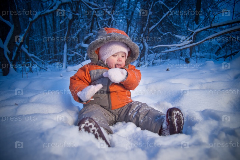 Маленький ребенок играет в зимнем парке