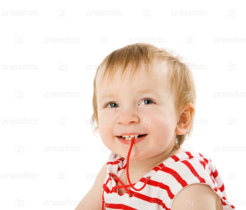 Радостный ребенок в полосатой майке, изолированный на белом фоне