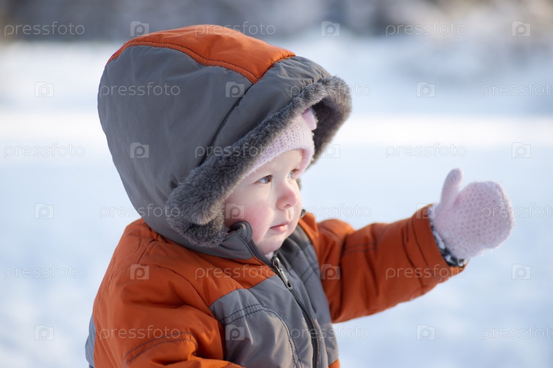 Маленький ребенок в теплой одежде смотрит на зимнее солнце