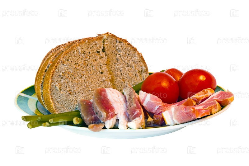 Тарелка с хлебом, маринованными помидорами и варено-копченым салом