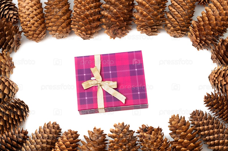 Коробка с подарком с еловыми шишками