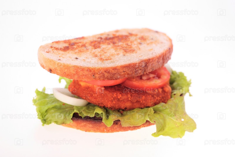 Бутерброд с помидорами и ветчиной на белом фоне