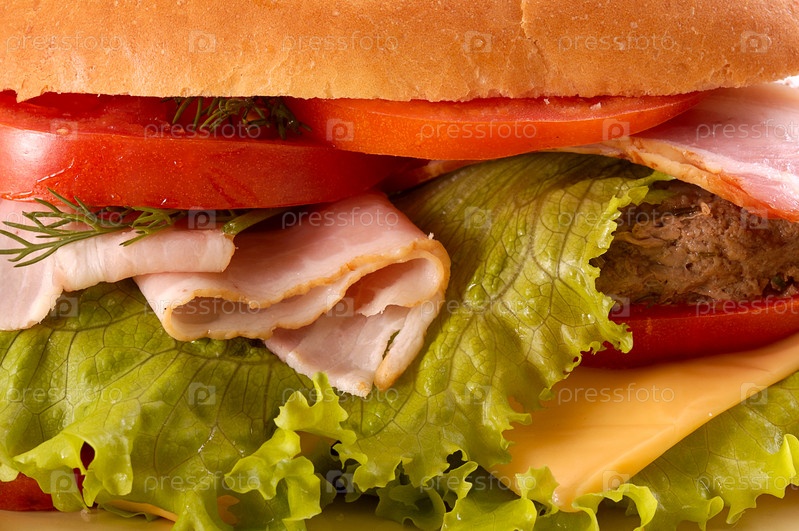 Большой гамбургер с ломтиком сыра, салатом, беконом, говядиной и помидором