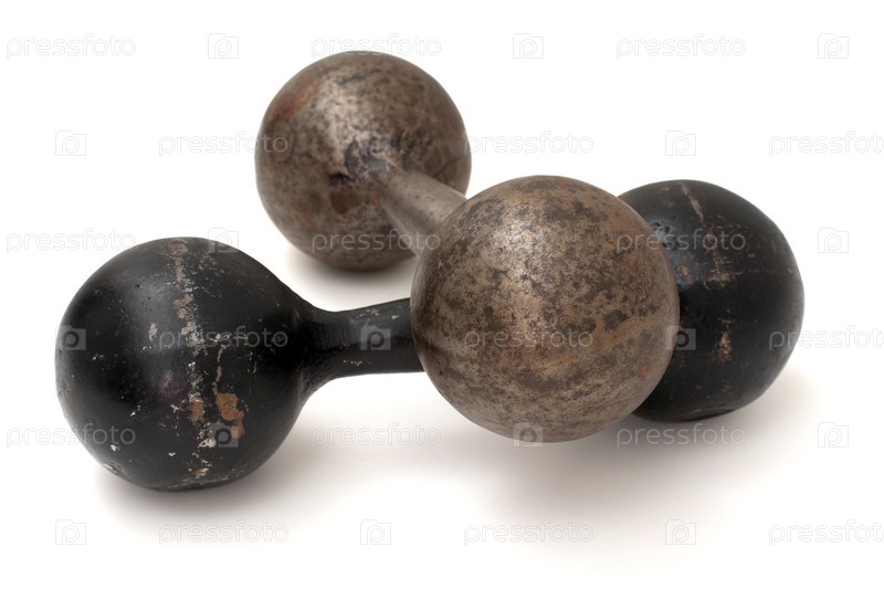 Два старых железных гантеля изолированы на белом фоне