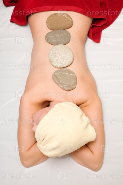 Девушка лежит с камнями на спине