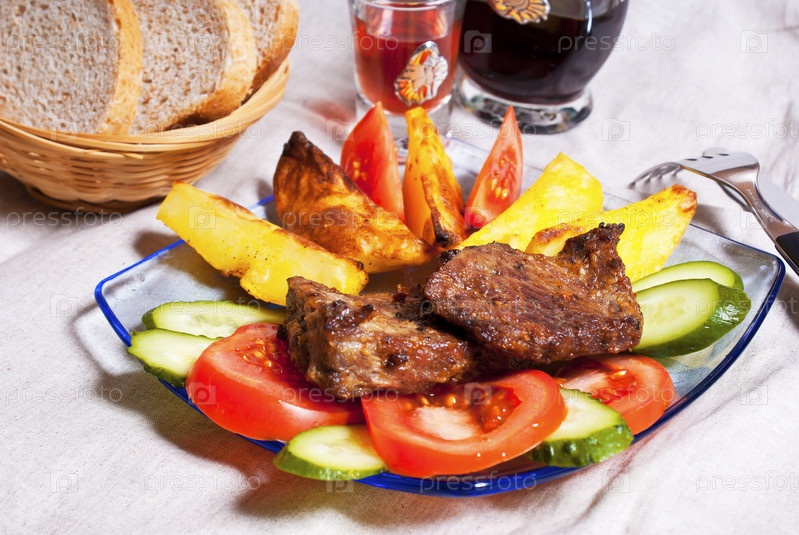 Мясо с овощами, вино и корзинка с хлебом