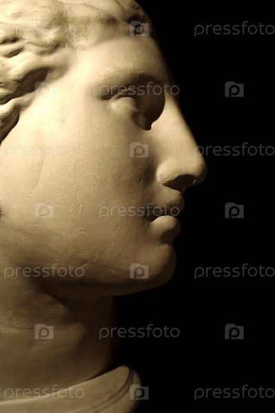 Гипсовая копия головы древнегреческой богини Афродиты на черном фоне