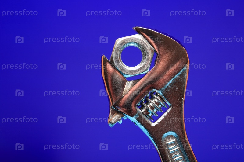 Крупным планом разводной ключ с гайкой на синем фоне