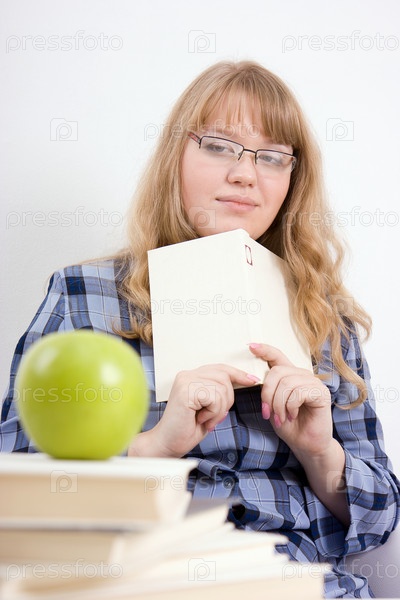 Молодая женщина с книгой смотрит на яблоко, лежащее на столе