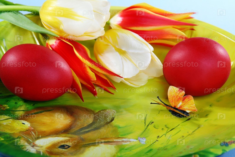 Пасхальные яйца и тюльпаны, лежащие на столе