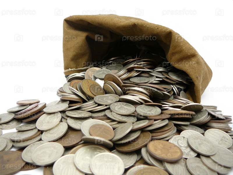 Рассыпанные монеты в мешке на белом фоне