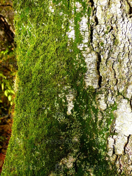 Зеленый мох на березовой коре