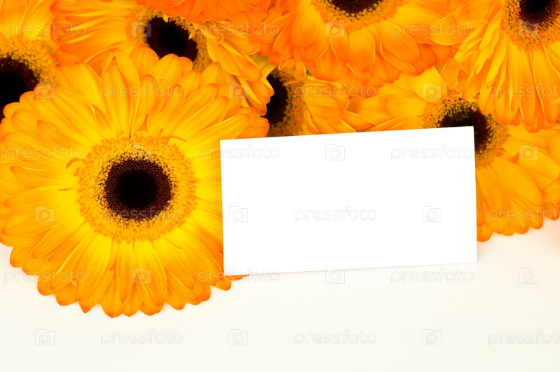 Желтые герберы и карточка на белом фоне