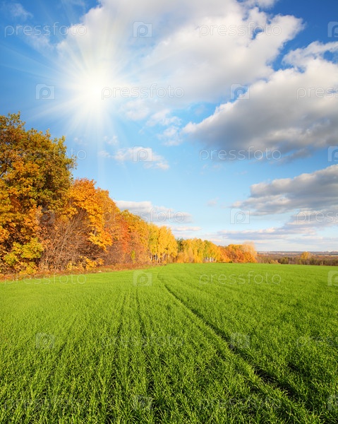 Осенний пейзаж с зеленым полем