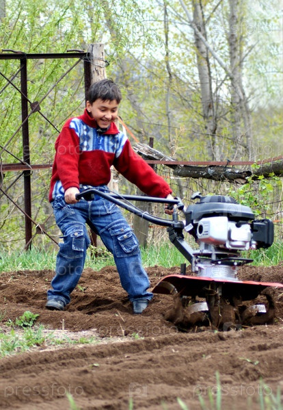 Маленький мальчик, работающий в саду с культиватором