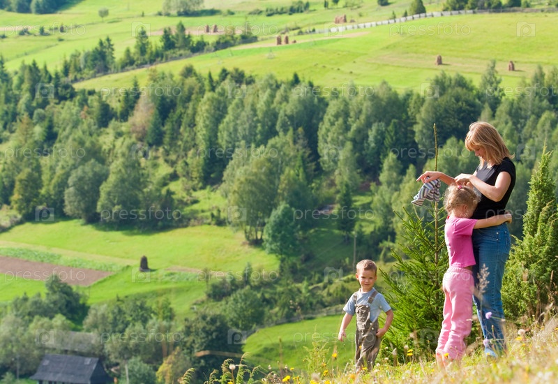 Маленькие мальчик и девочка с мамой на вершине горы