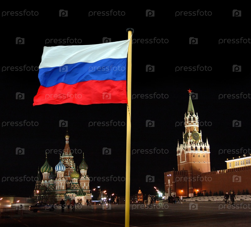 Государственный флаг России на Красной площади на фоне Кремля