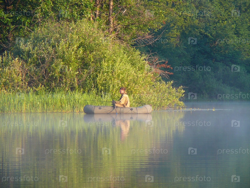 Рыбак в резиновой лодке на озере