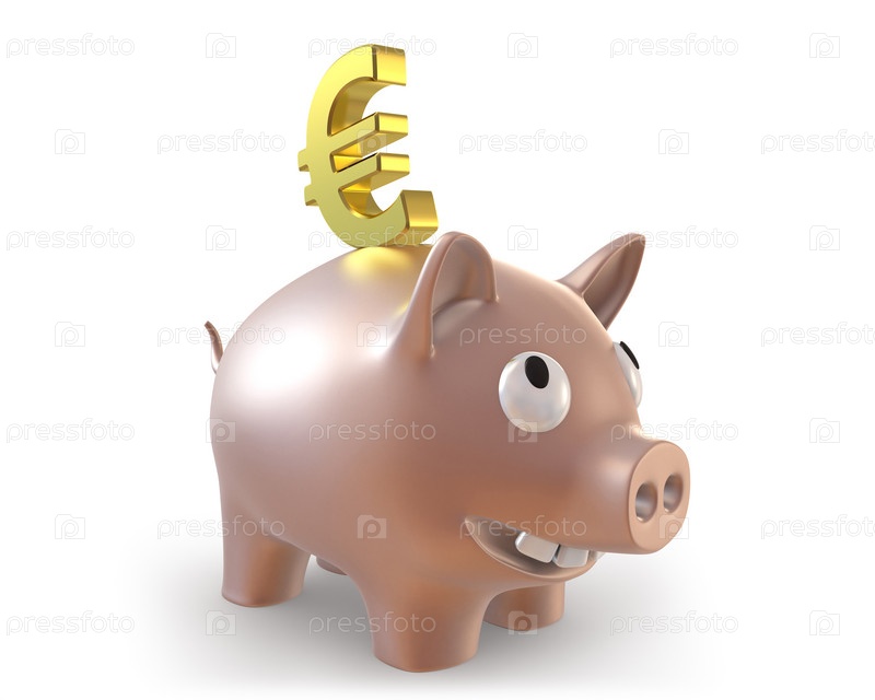 Копилка в форме поросенка и знак евро на белом фоне