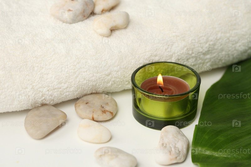 Зажженная свеча и камни для спа-процедур