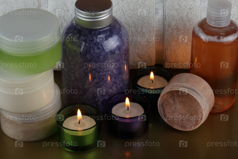 Зажженные свечи и флаконы со средствами для спа-процедур