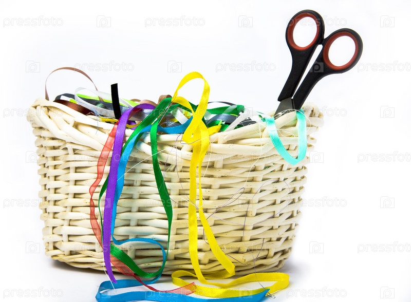 Ножницы и разноцветные ленточки в корзинке