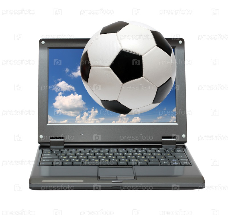 Футбольный мяч, вылетающий из экрана ноутбука