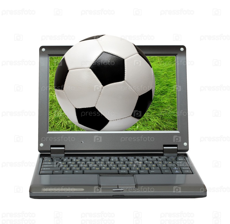 Футбольный мяч, вылетающий из экрана ноутбука