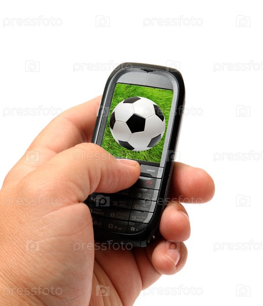 Маленький черный мобильный телефон в руке, футбол