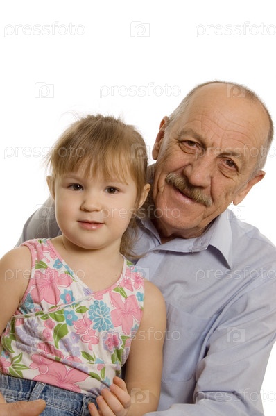 Дедушка с внучкой на белом фоне