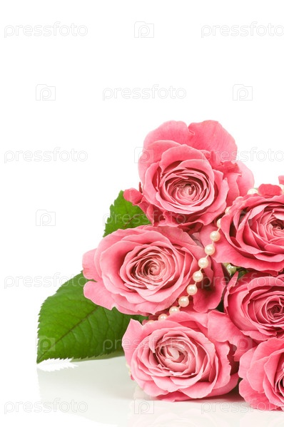 Красивые розы с бусами на белом фоне
