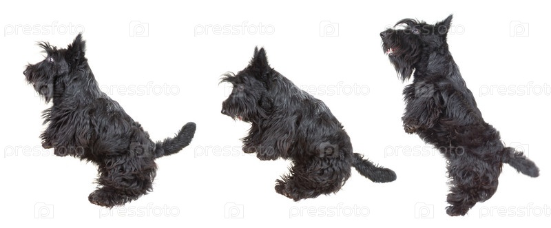 Щенок шотландского терьера прыгает в воздухе на белом фоне