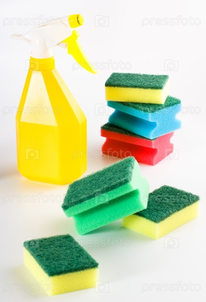 Желтая бутылка с спреем и многоцветные губки на сером фоне
