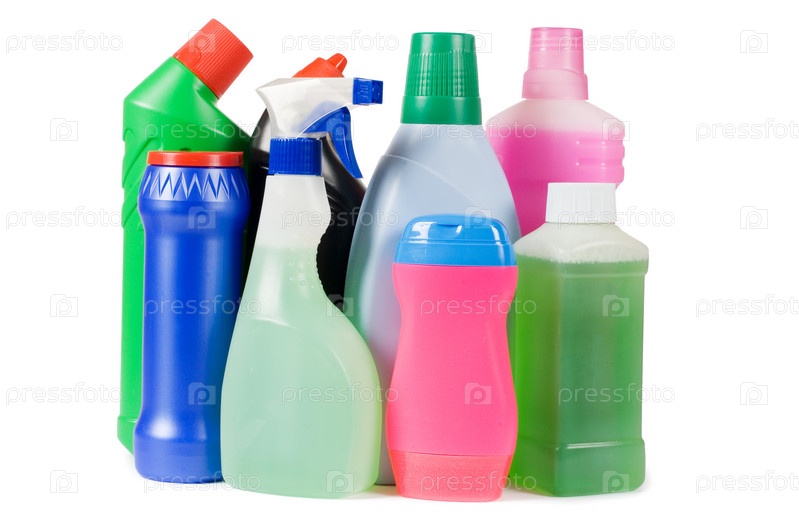 Бутылки с моющими средствами на белом фоне