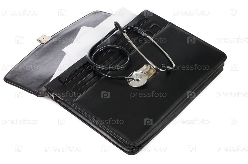 Черный портфель и фонендоскоп на белом фоне