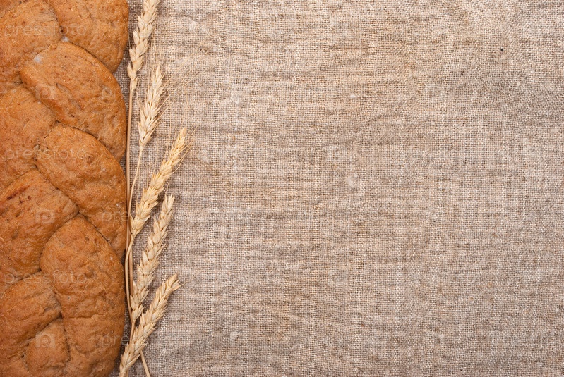 Колосья пшеницы и хлеб на мешковине