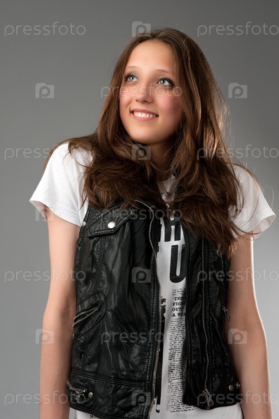 Портрет молодой счастливой девушки на сером фоне