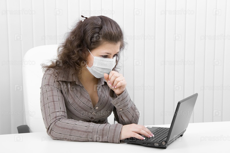 Бизнес-леди работает в офисе в медицинской маске