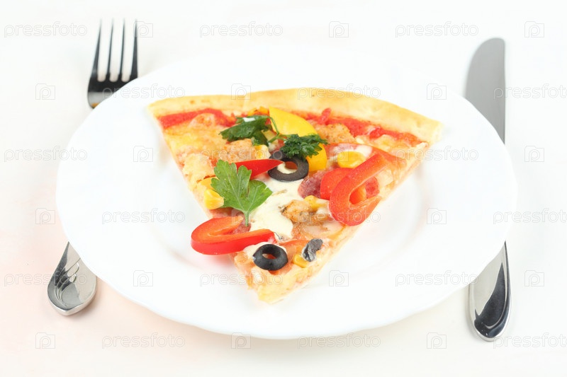Кусочек пиццы на белой тарелке