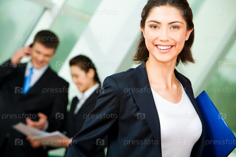 Портрет счастливой деловой женщины, смотрящей на камеру в офисе