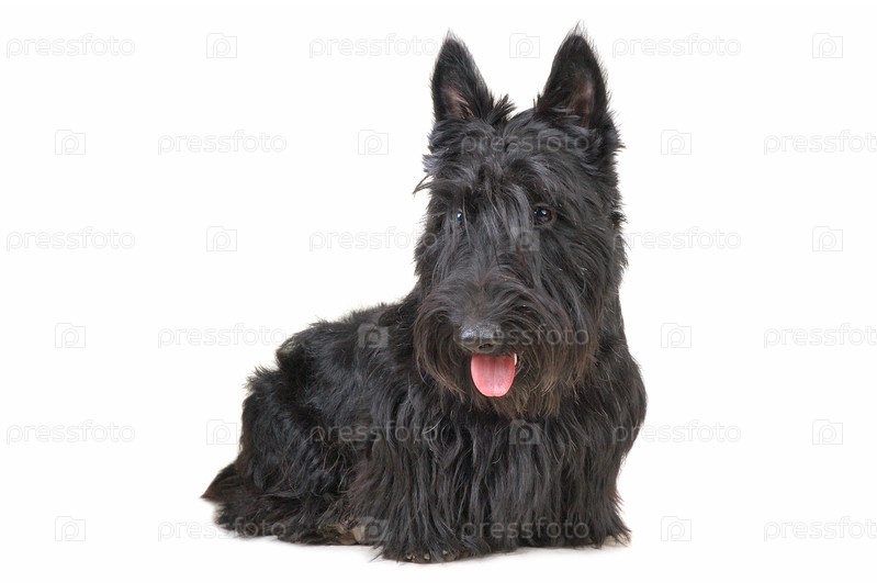 Щенок шотландского терьера смотрит вниз на белый фон