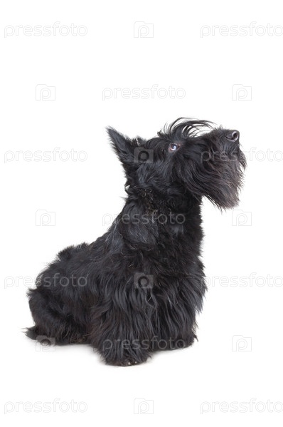 Щенок шотландского терьера смотрит вверх на белый фон