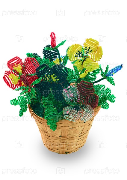 Изделия ручной работы: ваза с цветами из стеклянных бусин и проволоки. Желтый, синий, розовый, белый почки. Зеленые листья. Бутылка для березы