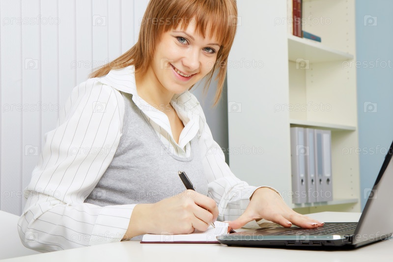 Привлекательная девушка работает в офисе