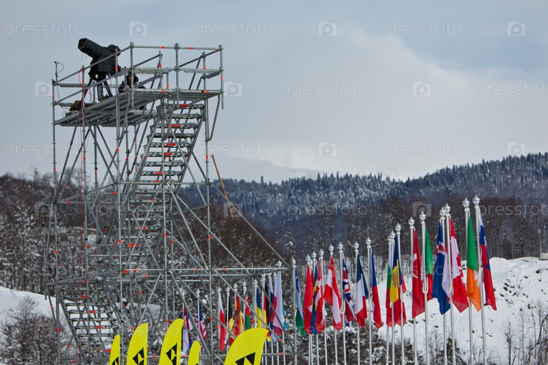 Флаги различных стран на фоне гор