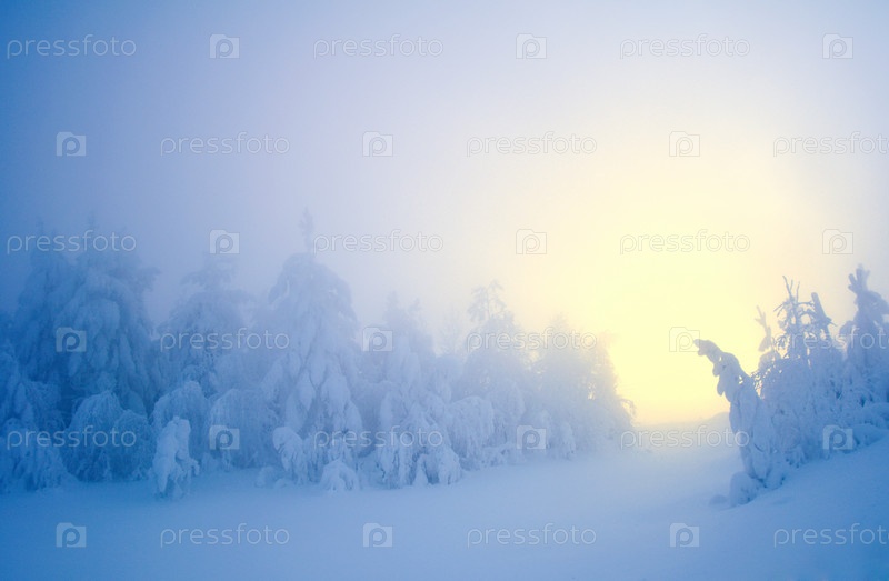 Вечером зимой покрытый снегом лес. суровая сибирская тайга