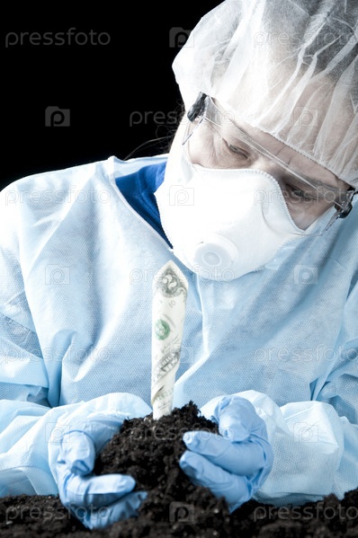 Женщина-ученый осматривает первые всходы доллара, выращенного в лабораторных условиях