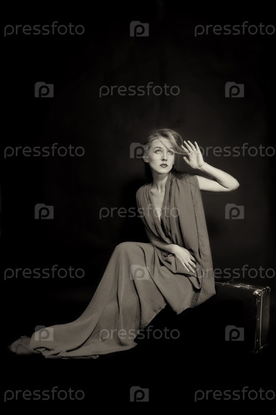 Женщина с чемоданом на черном фоне