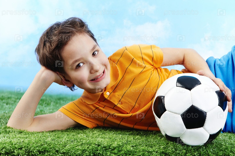 Мальчик с мячом лежит на траве