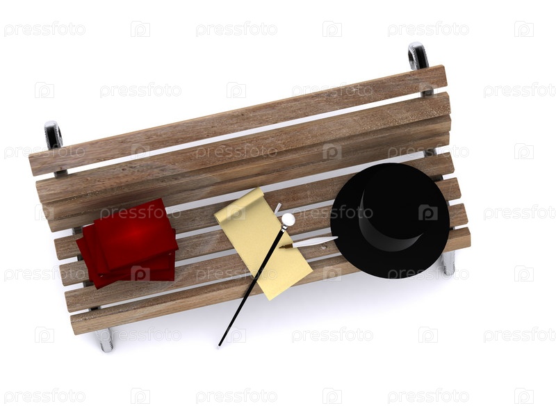 Трость, шляпа, бумага, перо и стопка книг, лежащие на скамейке